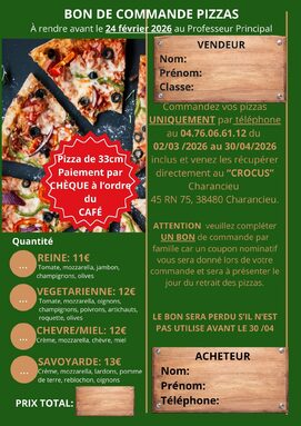 Par EMILIE LAURENT, publié le vendredi 23 janvier 2026 13:22 - Mis à jour le lundi 26 janvier 2026 09:23Veuillez trouver ci-joint un bon de commande pour choisir et réserver vos pizzas pour financer une partie du voyage en Italie de nos élèves. Commandes à passer avant le 24/02. -