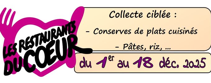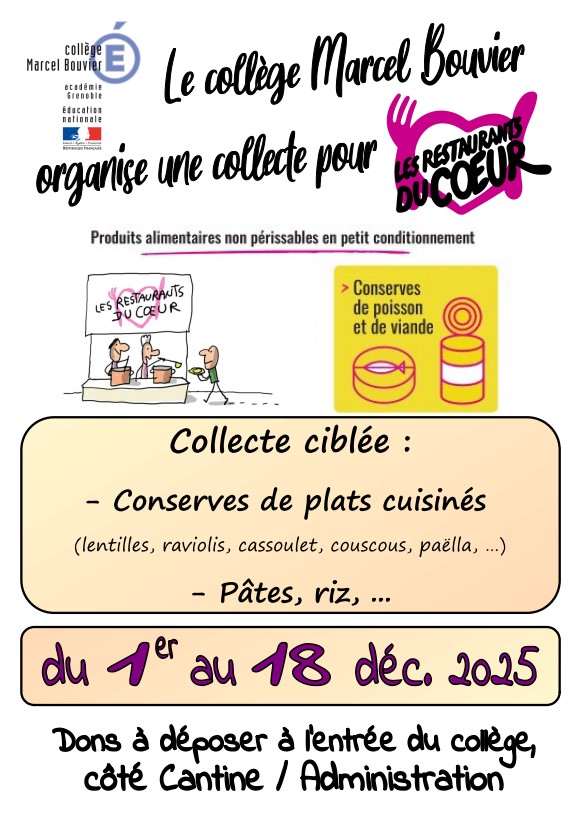 Les élèves du CVC (Conseil de la Vie Collégienne) organisent une collecte pour les Restos de Coeur du 1er au 18 décembre 2025.
