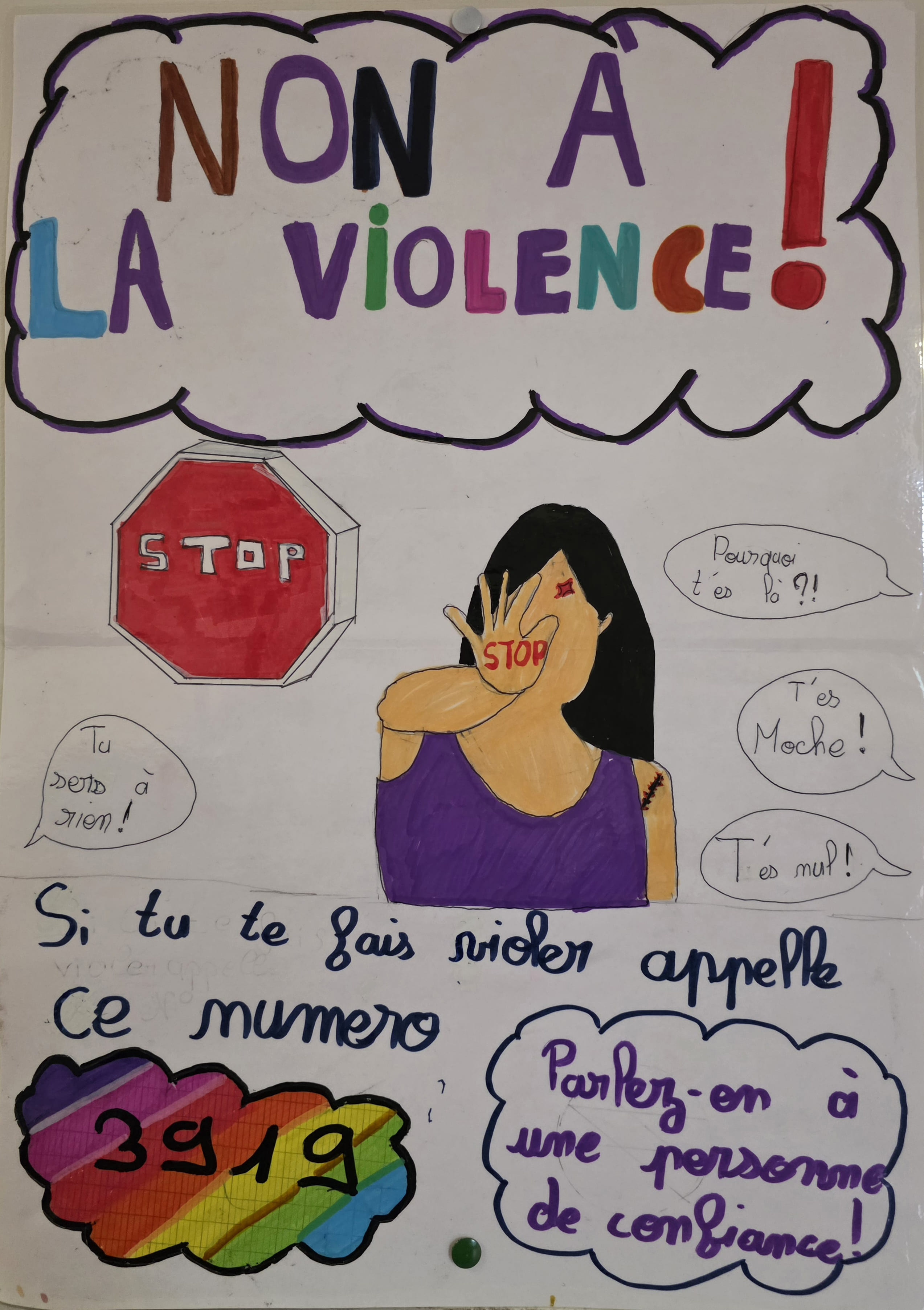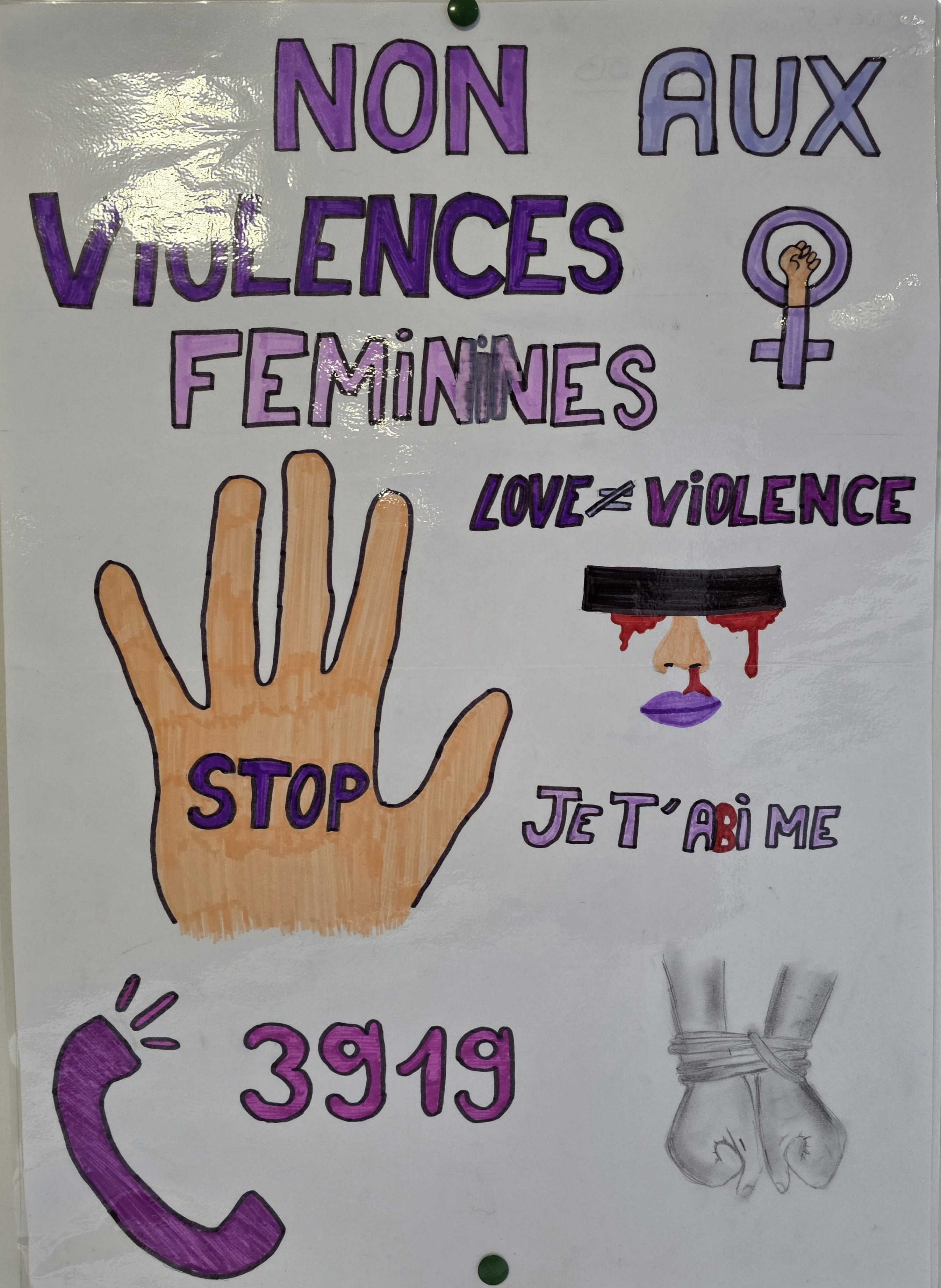 Chaque classe a participé à un atelier de réflexion et de création autour du thème du 25 novembre. Les élèves ont produit des affiches engagées et créatives, témoignant de leur compréhension et de leur implication.